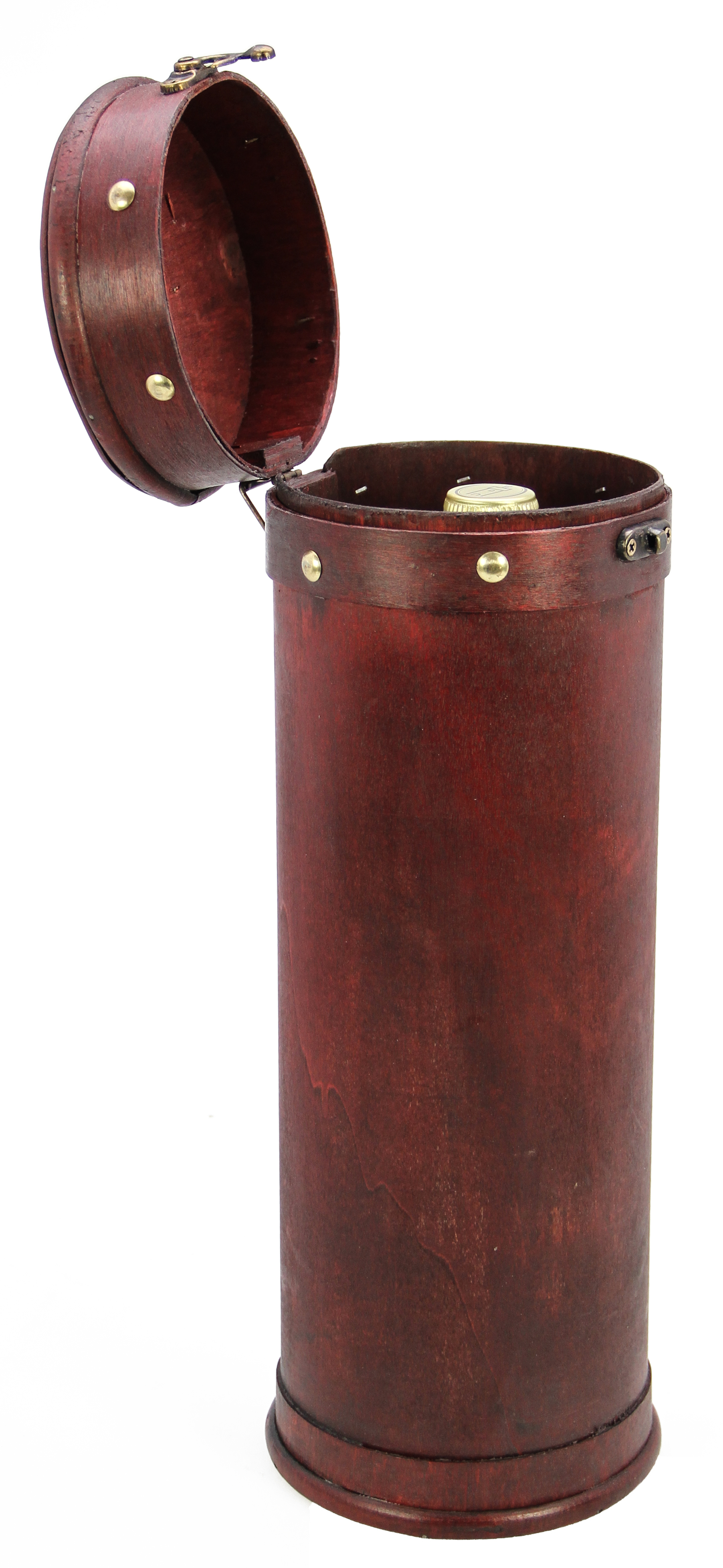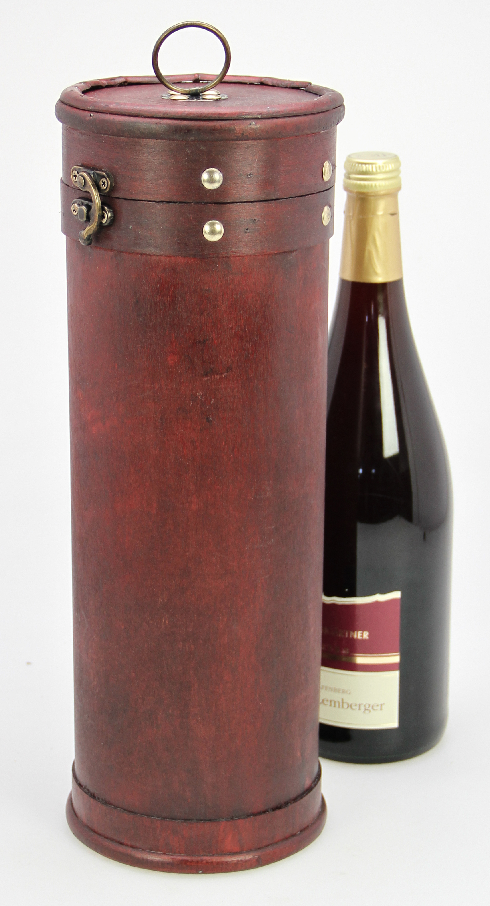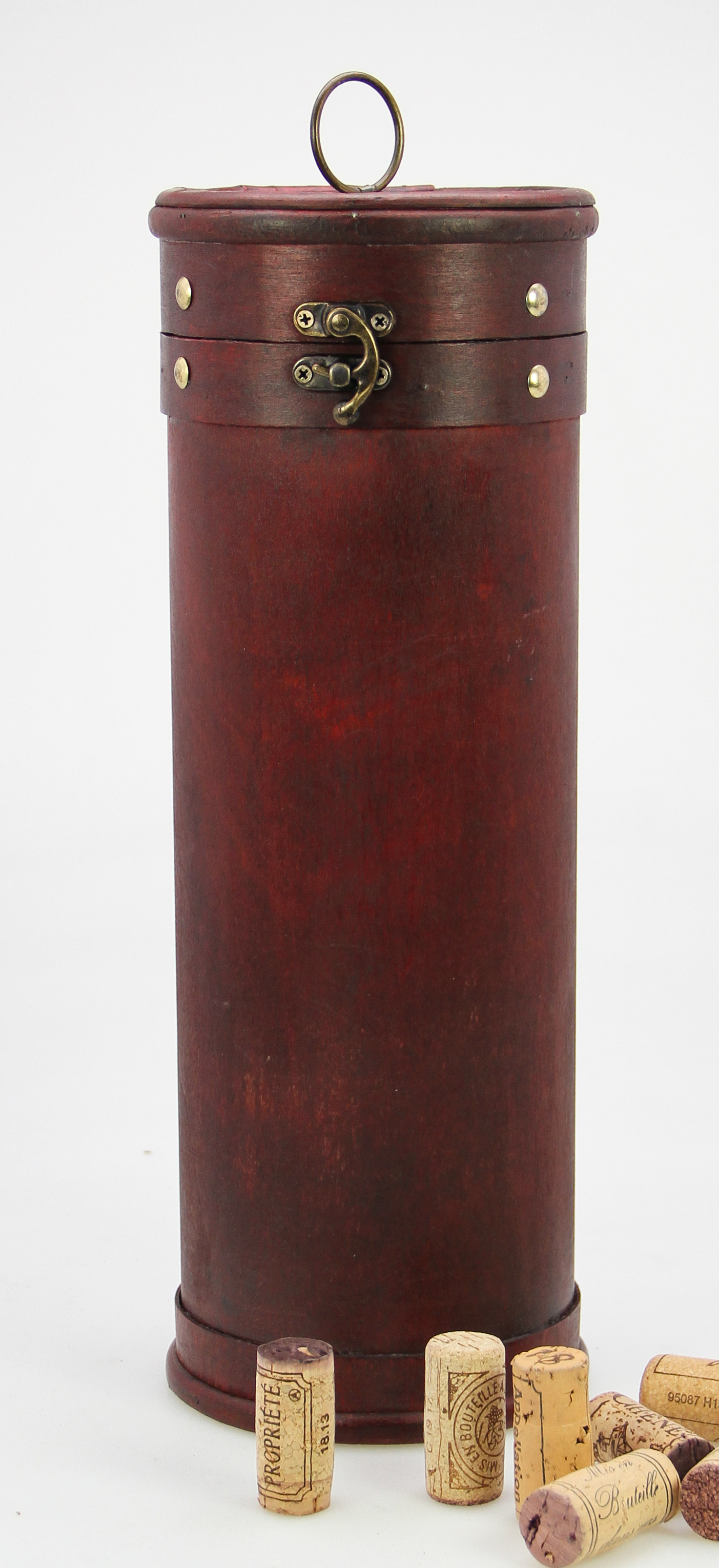 Contenitore per bottiglia di vino in legno, rotondo, ideale anche come elegante confezione regalo o oggetto decorativo.