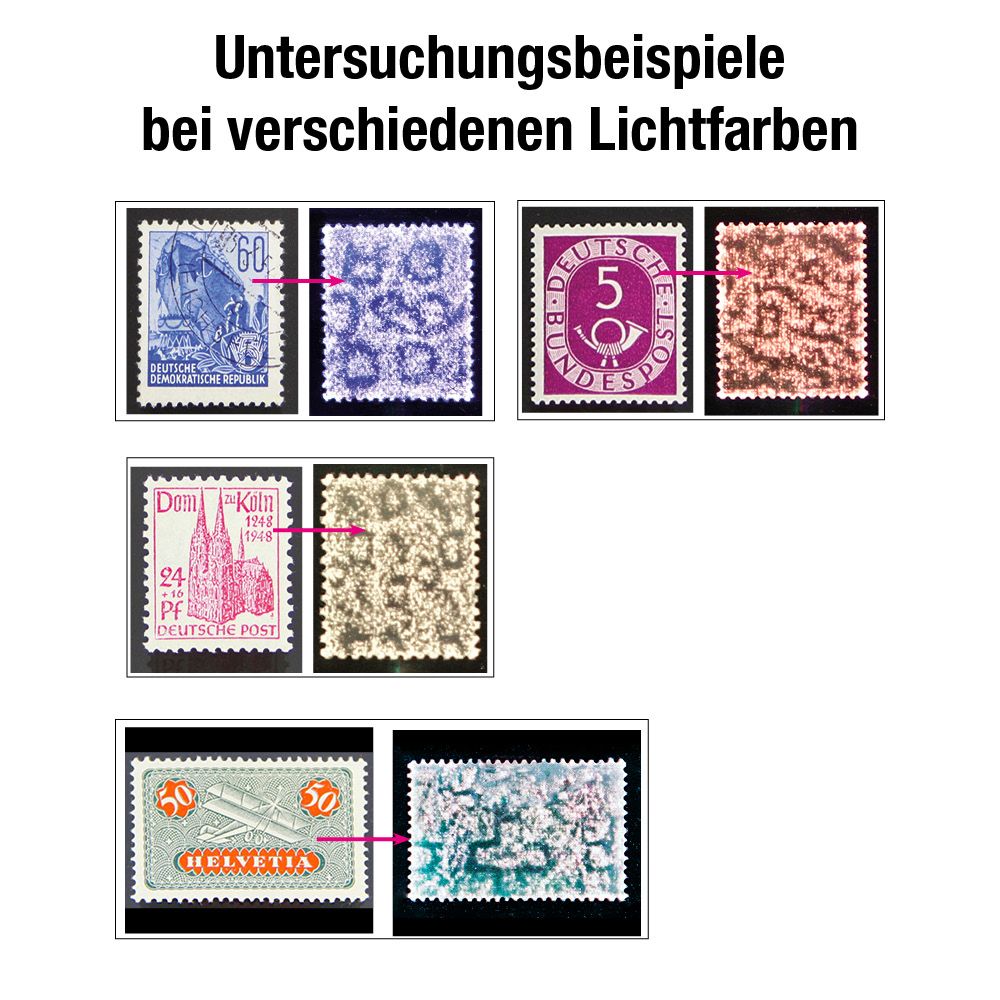 È possibile impostare 8 diversi colori e 3 diverse luci diurne/bianche, come luci di esame centrali. I colori possono migliorare il risultato dell'esame, ad esempio illuminando con luce rossa un francobollo a fondo rosso e "neutralizzando" così l'inchiostro di stampa rosso che potrebbe trasparire sul retro del francobollo. La filigrana, la riparazione... non sono disturbati da influenze cromatiche indesiderate e risaltano più chiaramente.