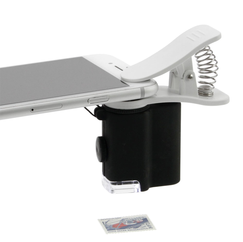 Questo microscopio trasforma il vostro smartphone in un microscopio digitale con ingrandimento 60x. Con la funzione di fotocamera dello smartphone è possibile riconoscere i dettagli più fini, come i processi di stampa dei francobolli. Le viste di dettaglio ingrandite possono essere salvate come foto.