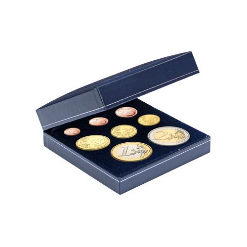 Spingere le monete - pronto! La moneta rimane in posizione inserita e approfondita. - Custodia blu scuro, intarsio in schiuma dura blu floccato. - Per monete fino a 80 mm di diametro (anche in capsule) o per un set completo di € (da 1 centesimo a 2 €). - Dimensioni: Circa 90 x 90 x 30 mm.