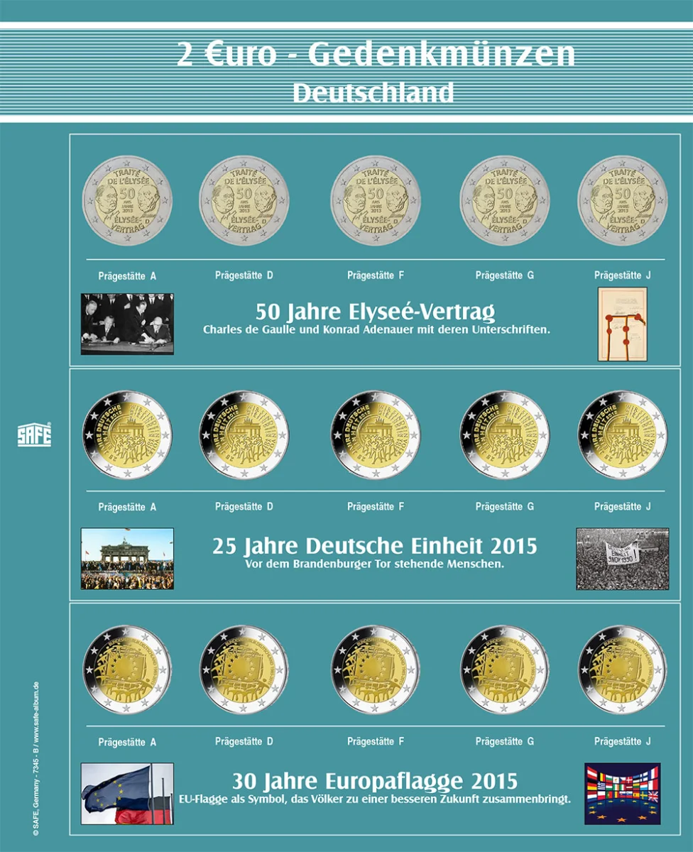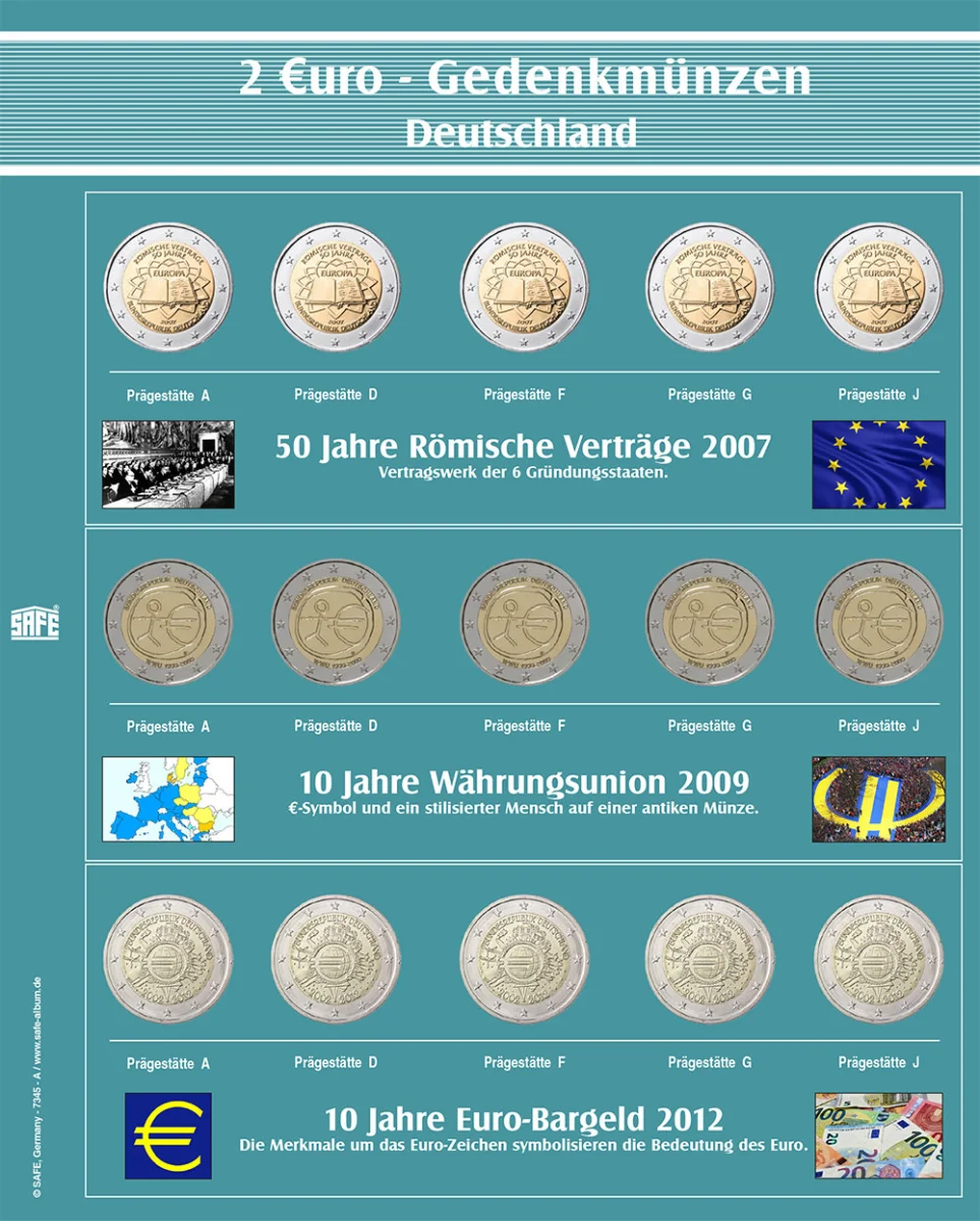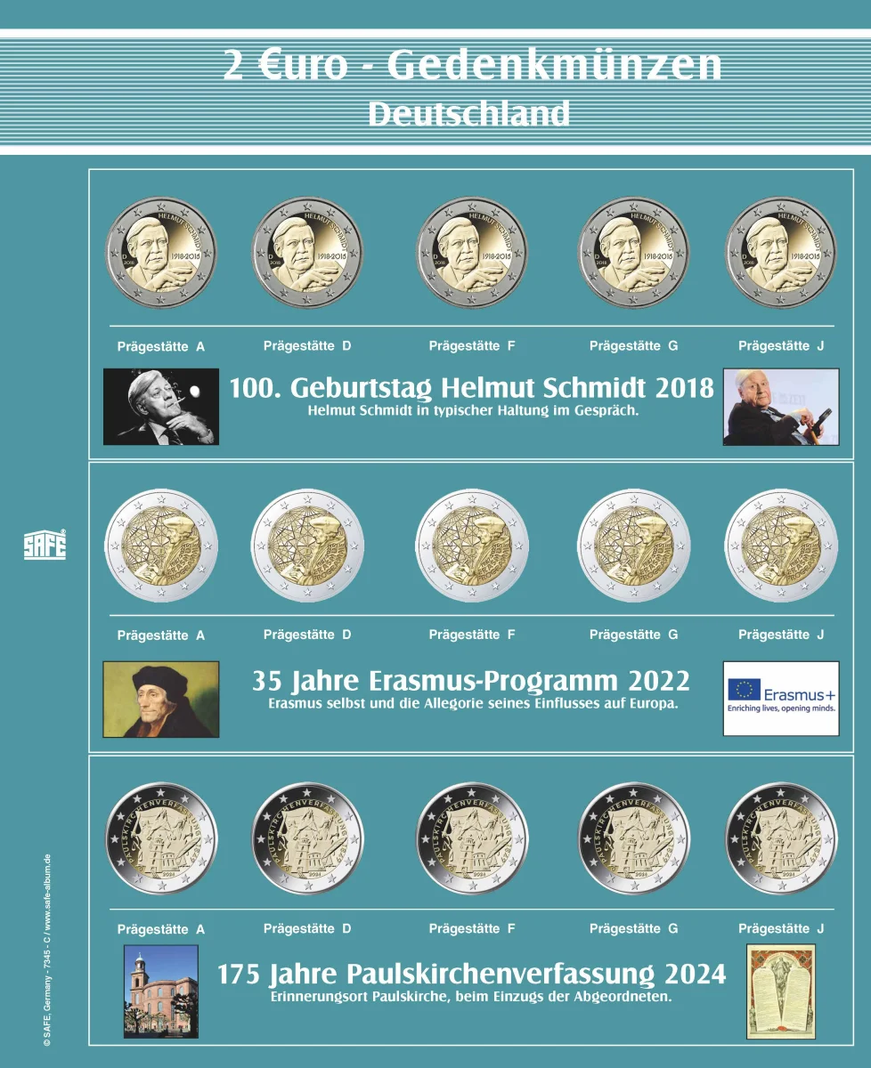 Caratteristiche speciali: - Copertina nera di alta qualità con robusto meccanismo a 4 anelli. - Formato album: circa 235 x 265 x 45 mm. - Con placchetta metallica 2 Euro sulla copertina e sul dorso. - Fogli trasparenti per inserire le monete delle 5 zecche Germania + cartoncini prestampati a coloriN. 7345-B1 Album “2€ commemorative della Germania delle 5 zecche (Serie 1 con 7 fogli per monete più cartoncini prestampati a colori)Con 7 fogli per tutte le monete commemorative da 2 euro Gemania "Serie 1" fino al 2021 "Sassonia-Anhalt" e 2022 "Turingia".La collezione completa in un album rappresentativo. Include anche il 30° anniversario della caduta del muro di Berlino (2019), Bundesrat e il 50° anniversario della Genuflessione di Varsavia (2020), Carlo Magno.Gli Stati federali emettono una seconda serie di monete commemorative da 2 euro con il volume 2 (5 zecche ciascuno). Amburgo inizierà nel 2023 con il motivo "Elbphilharmonie". Tutte le emissioni saranno incluse nel volume2. N. 7345-B2 Album “Album “2€ commemorative della Germania delle 5 zecche” 2a serie incl. foglio 7345-8 con Amburgo/Mecklenb.-Vorpommern 2023/2024 (serie 2)
