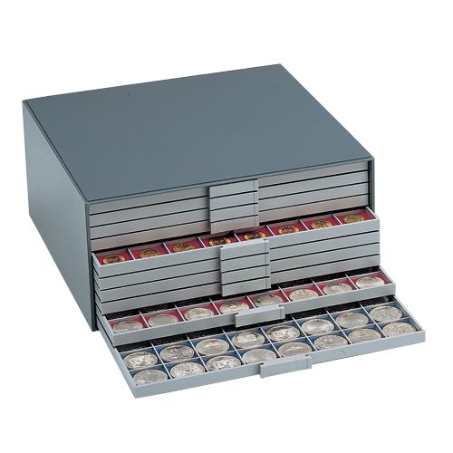 Quasi nessun altro sistema offre una tale varietà di combinazioni possibili per la vostra collezione di monete! I collezionisti di alcuni temi di monete saranno particolarmente soddisfatti dell'alta variabilità nell'accogliere le loro monete diversamente confezionate (capsule, foglio, blister, ecc.) nei nostri stipetti. - Il contenitore Maxi (vuoto - senza cassetti) n. 6100 è adatto per 10 cassetti (Nr. 6101, 6103 – 6112) - Disponibile in colore grigio. - Le dimensioni sono L 298 x P 298 x A 139 mm. - Max. Altezza di riempimento dei singoli elementi: 9 mm, cioè adatto anche per monete in capsule.