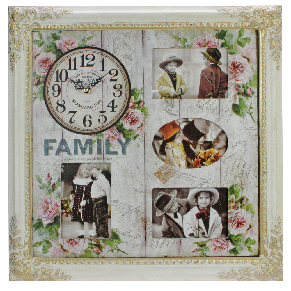 Bella cornice in stile barocco. Con orologio e 4 portafotografie.
