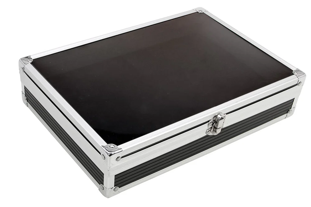 Le vetrine da collezione Compact-Black hanno angoli e bordi rinforzati in metallo e sono dotate di un coperchio trasparente ribaltabile con chiusura a scatto per una visione senza ostacoli degli oggetti da collezione. I pannelli laterali neri della vetrina presentano un'elegante struttura ondulata e creano un affascinante contrasto con i bordi argentati.
