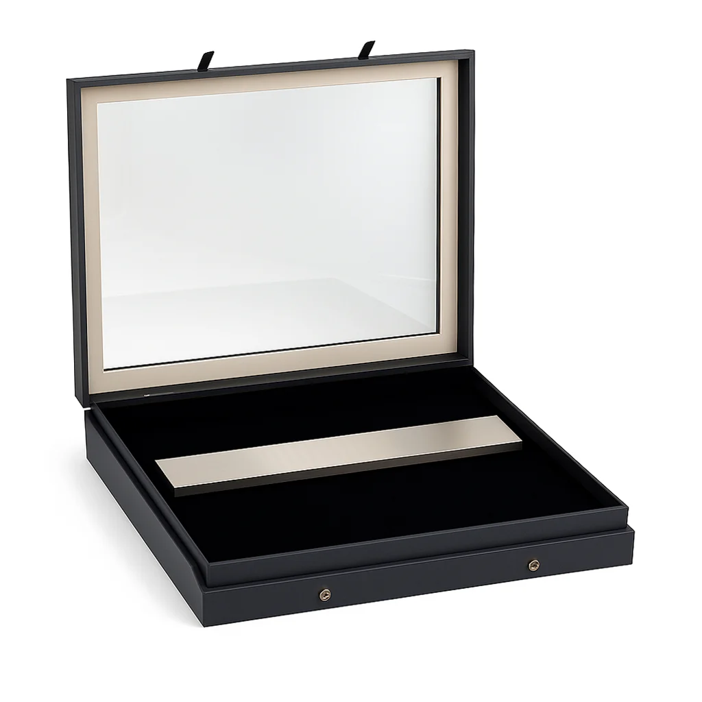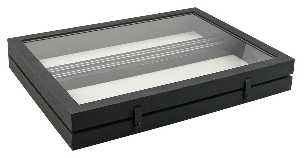 Questa vetrina per coltelli di alta qualità ha una struttura robusta con un coperchio in vetro vero e una superficie in lino nero opaco che mette in risalto la vostra collezione di coltelli.